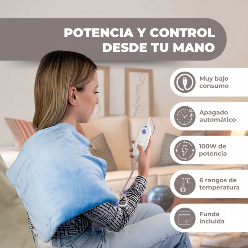 Almohadilla eléctrica | 40x30 cm | 6 niveles | Muy bajo consumo | Gasto mínimo | Apagado automático | Funda azul | Mobiclinic
