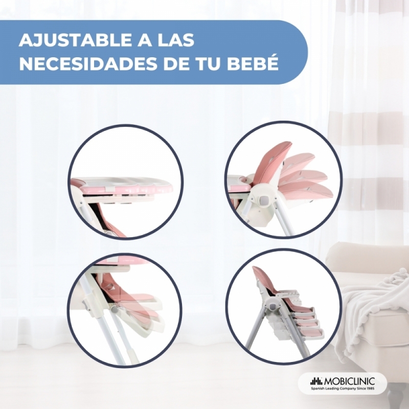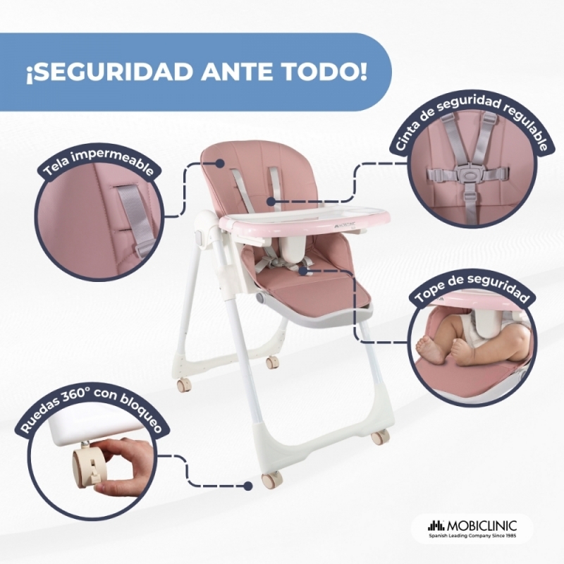 Trona con ruedas | Evolutiva | Altura ajustable | Plegable | Bandeja extraíble | Arnés de sujeción | Rosa | Simba | Mobiclinic