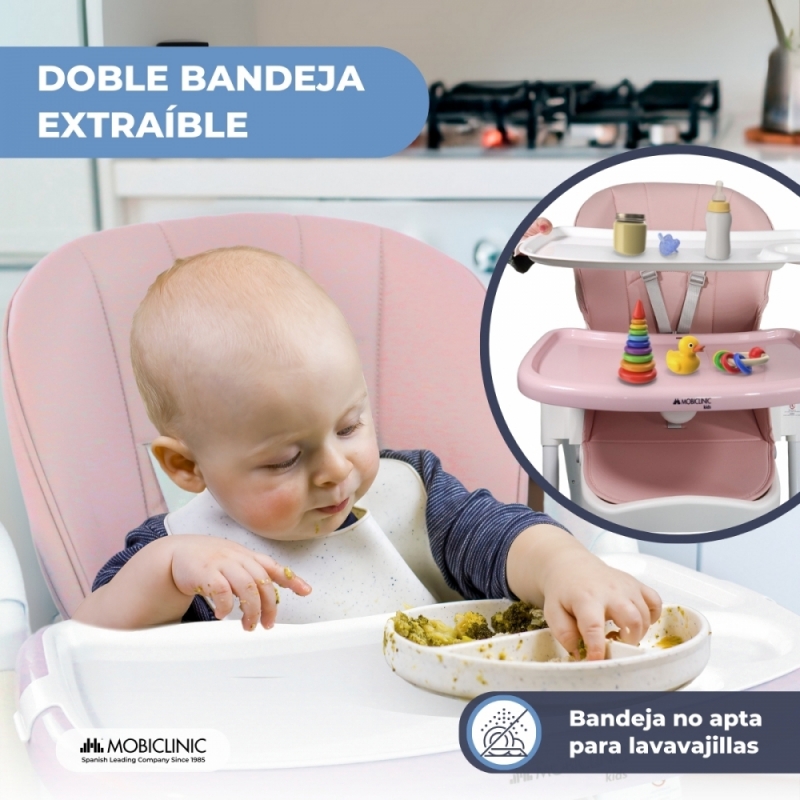 - Su bandeja extraíble para convertirla en silla alta con seguridad mientras el padre o la madre realizan otras tareas.