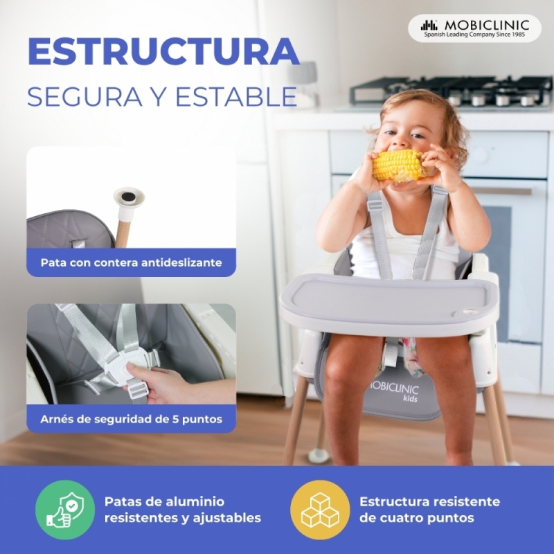 Su bandeja ajustable ofrece tres posiciones para adaptarse a las necesidades específicas de tu pequeño, ya sea para alimentarse o jugar cómodamente teniendo la posibilidad de retirarse completamente. Además, con correas de seguridad ajustables y arnés de 5 puntos, puedes disfrutar de la tranquilidad durante cada comida o sesión de juego, sabiendo que tu bebé está protegido en todo momento.