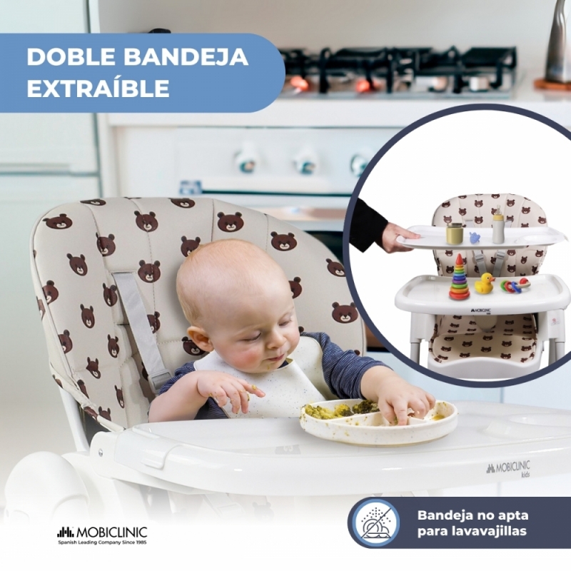 Sus materiales están pensados para una higiene rápida y eficaz en caso de manchas tanto de sólidos como de líquidos. Por ello, su doble bandeja ayuda a que los restos de comida no queden incrustados y se puedan lavar directamente con un trapo húmedo.