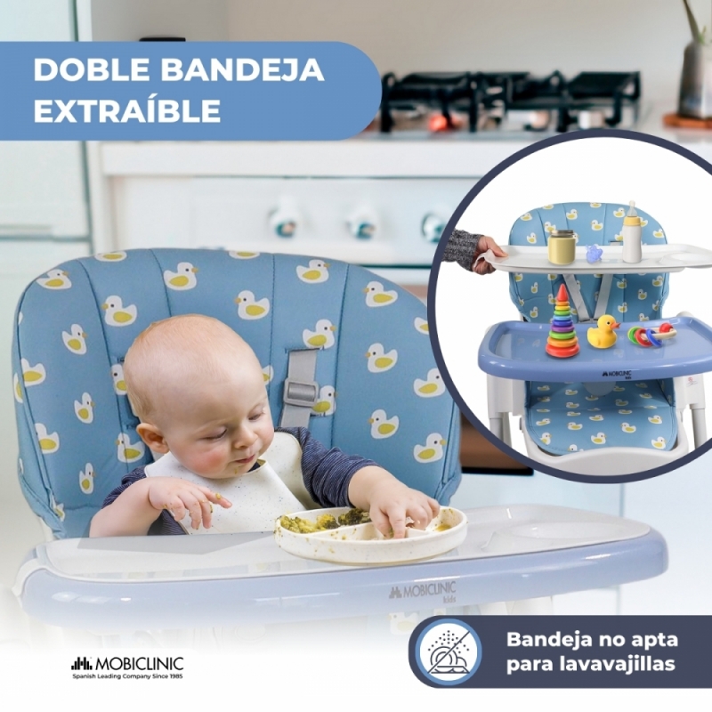Sus materiales están pensados para una higiene rápida y eficaz en caso de manchas tanto de sólidos como de líquidos. Por ello, su doble bandeja ayuda a que los restos de comida no queden incrustados y se puedan lavar directamente con un trapo húmedo.