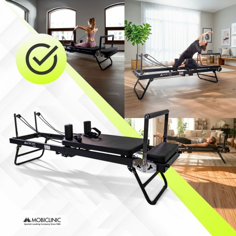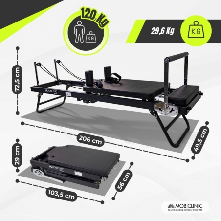 DISEÑO PLEGABLE Y ESTABLE: Esta máquina de pilates está diseñada en acero y soporta hasta 120 kg y usuarios de hasta 180 cm de altura. Se pliega de manera fácil y rápida y puede trasladarse gracias a sus ruedas traseras. Incluye alfombrillas antideslizantes para mayor estabilidad y seguridad