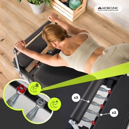 Su sistema cuenta con 5 muelles de resistencia que permiten ajustar la intensidad del ejercicio de manera fácil. Dispone de 3 muelles rojos de 20 kg y dos grises de 7.7 kg, que permiten variar el nivel de esfuerzo según la rutina o los músculos que se vayan a trabajar. A mayor número de muelles, mayor será la resistencia en el ejercicio, esto permite progresar de forma controlada y segura, adaptándose a los objetivos y necesidades de cada usuario.